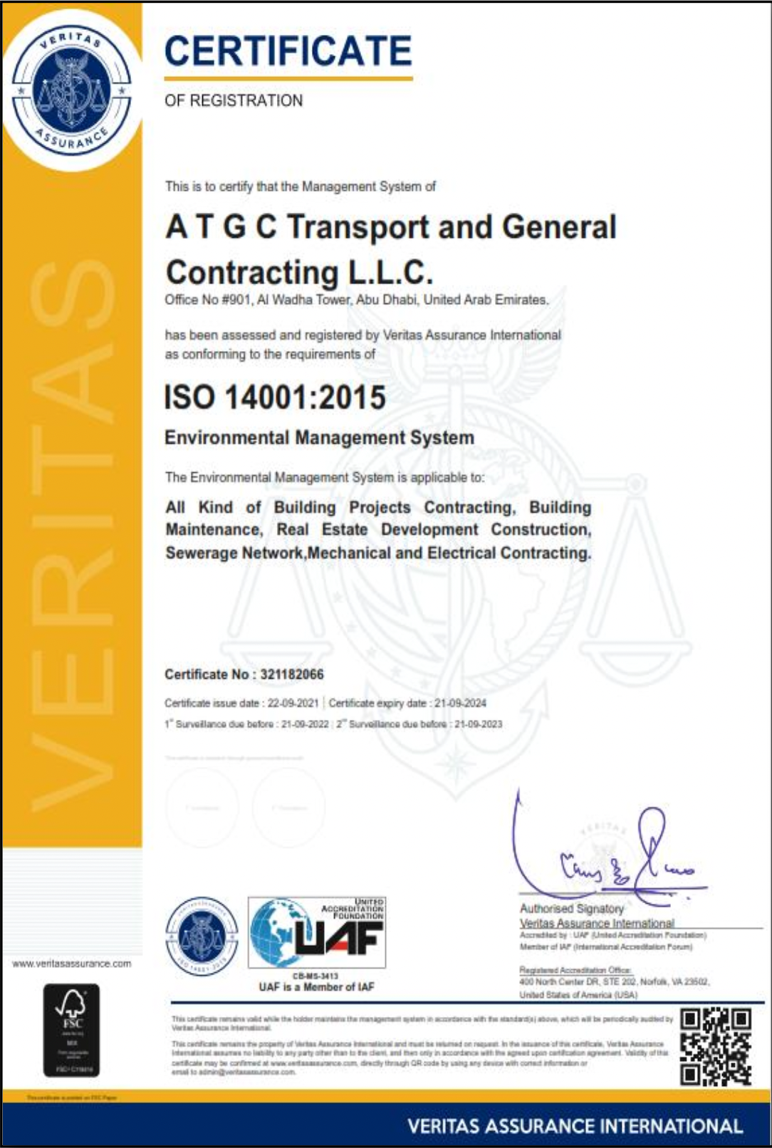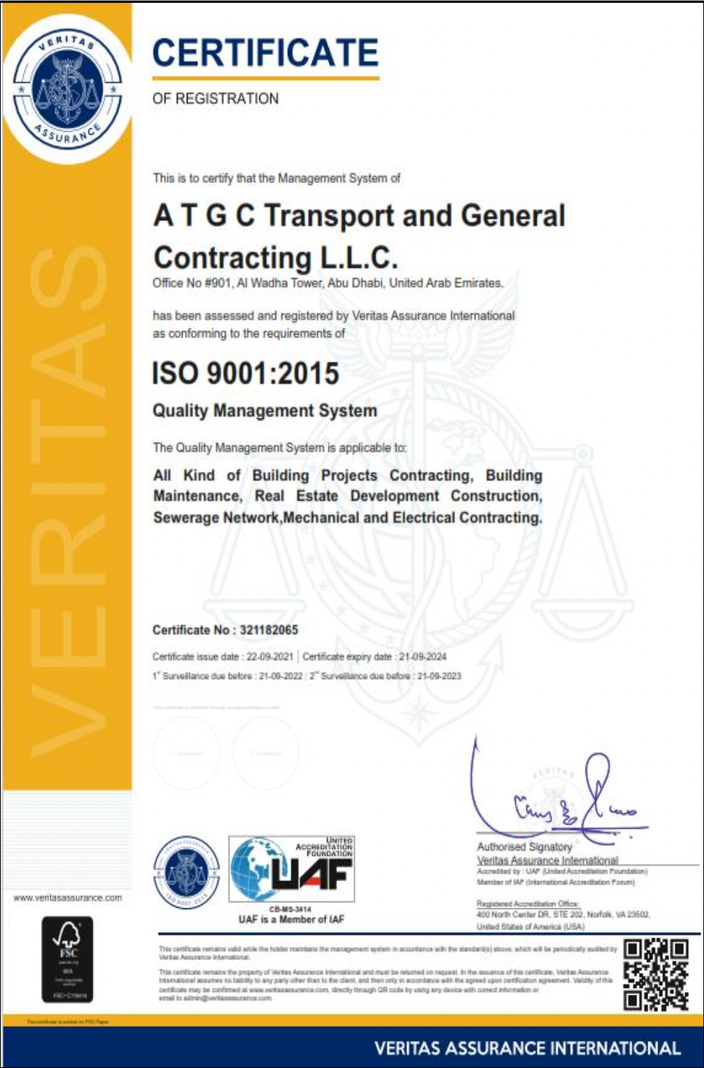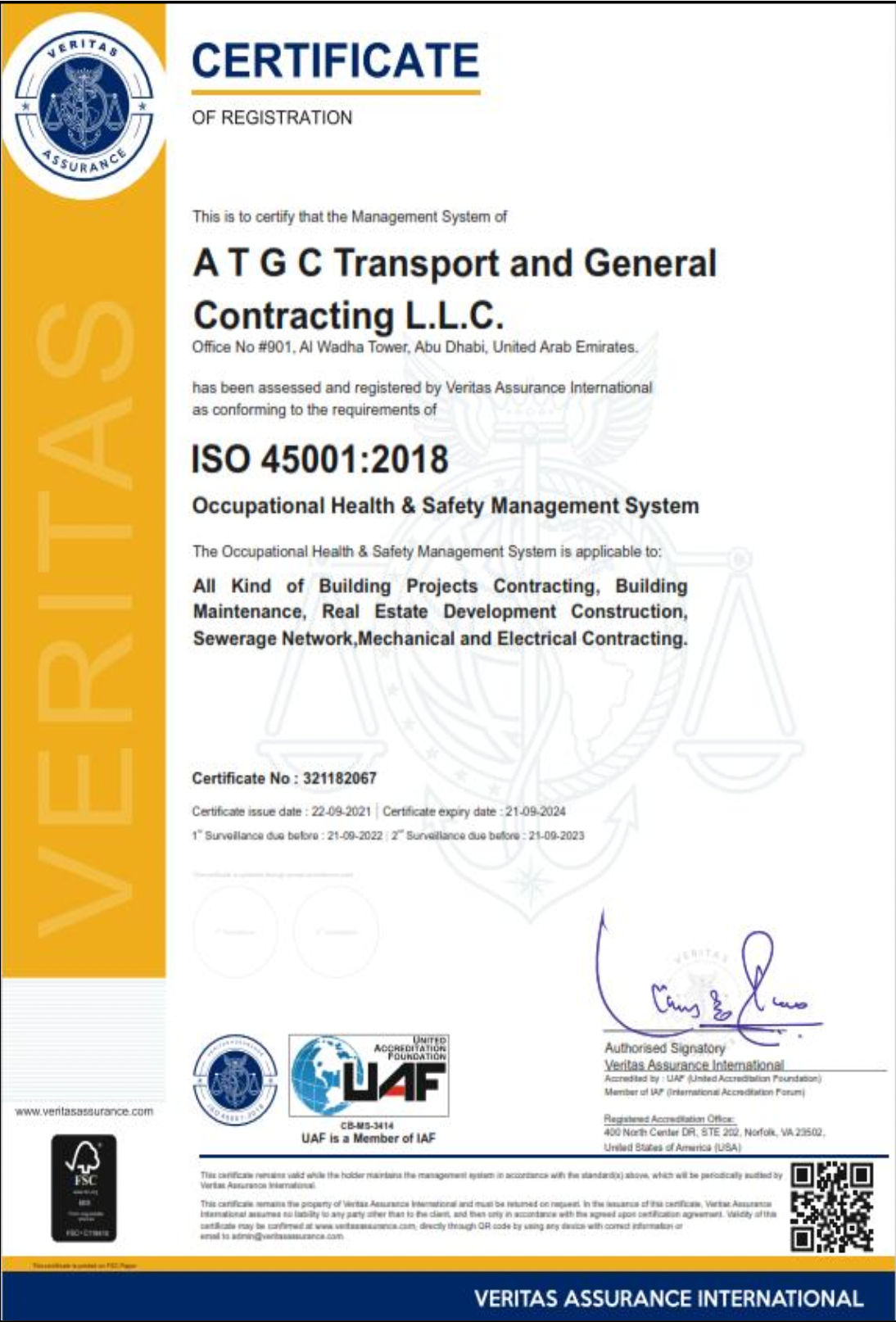 ATGC Transport & General Contracting LLC has achieved the ISO 9001:2015 recognition for the organization’s Quality Management System, ISO 14001:2015 guidelines provide an Environmental Management systems that makes ATGC competitive, and ISO 45001:2018 provides Occupational Health and Safety Management System.